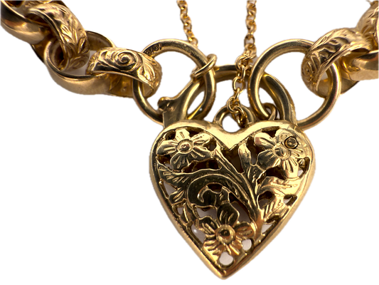 9K Yellow Gold Belcher Figaro Heart Locket Bracelet with Filigree Design and Curb Link Safety Chain